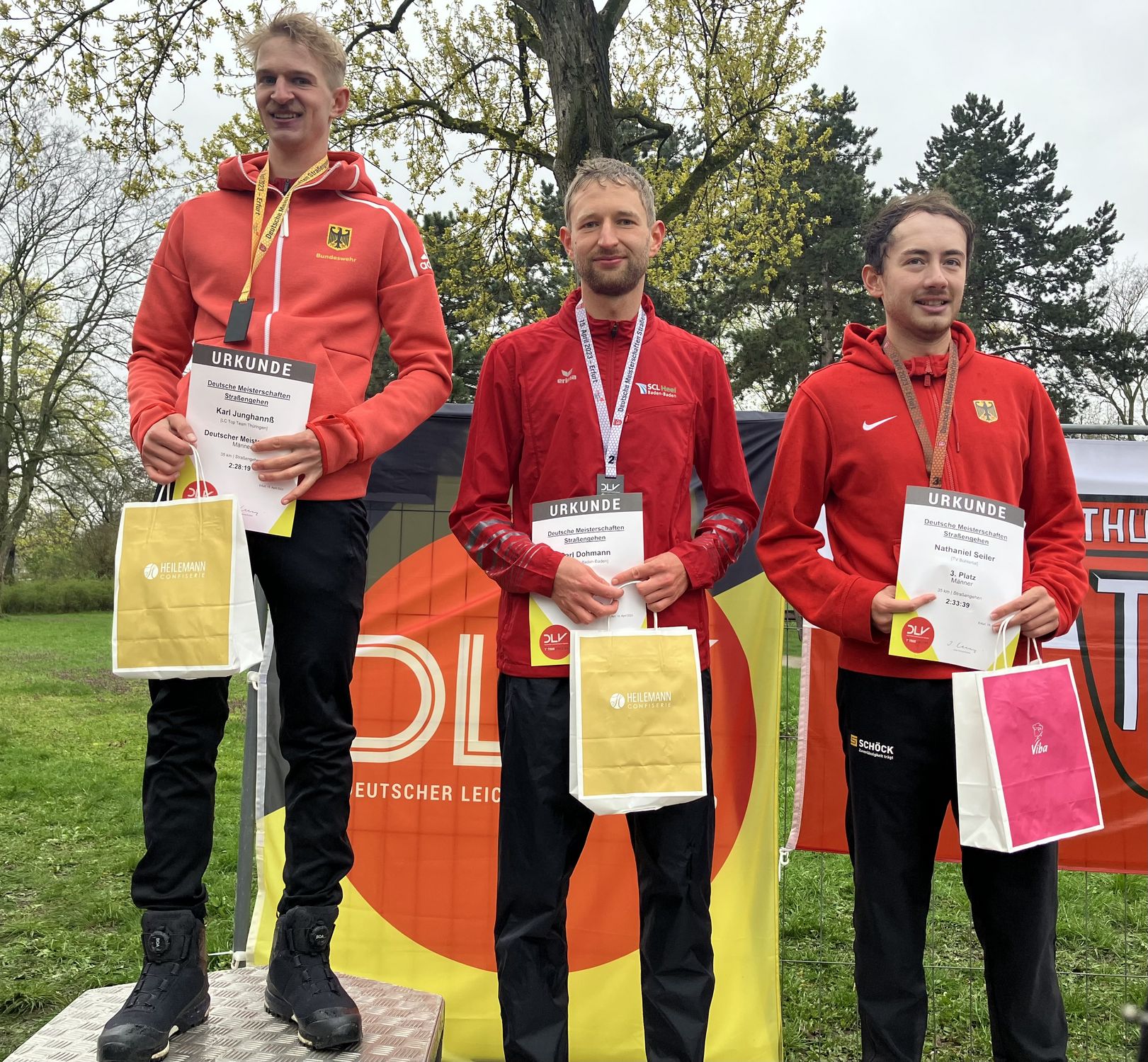 Am 15. April 2023 fanden in Erfurt die Deutschen Meisterschaften im Straßengehen bei Temperaturen um die 5 Grad Celsius und Dauerregen statt. Dabei brachte ein Trio aus Baden-Württemberg den kompletten Medaillensatz nach Hause.