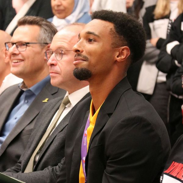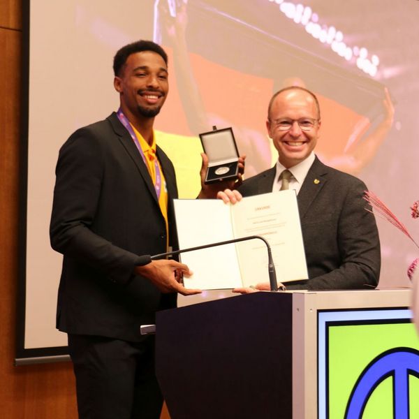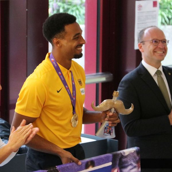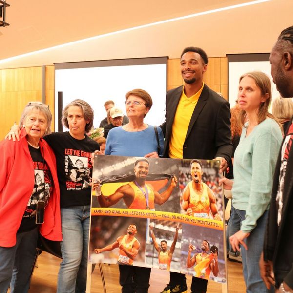 Auch Dieter Schneider, Präsident des WLVs, richtete an diesem Abend ein paar Worte an Leo. „Leo ist ein strahlender Diamant der Leichtathletik“, so bezeichnet der Präsident ihn in seiner Rede. Außerdem machte er deutlich, welche Erfolge der Athlet bereits verzeichnen konnte und dass Leo damit der beste deutsche Zehnkämpfer aller Zeit ist.