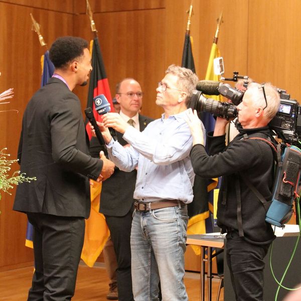 Dass Leo eine besonders freundliche und lockere Art hat, konnte man auch am Interview mit Kindern aus seiner ehemaligen Grundschule sehen. Dieses führten sie sogar auf Englisch, da Leo eigentlich in Texas wohnt. Auch das Fernsehen war vor Ort, unter anderem der SWR, der den Abend mitdokumentierte. Es folgte noch der Eintrag in das Goldene Buch der Stadt Leinfelden-Echterdingen und eine Überraschung.