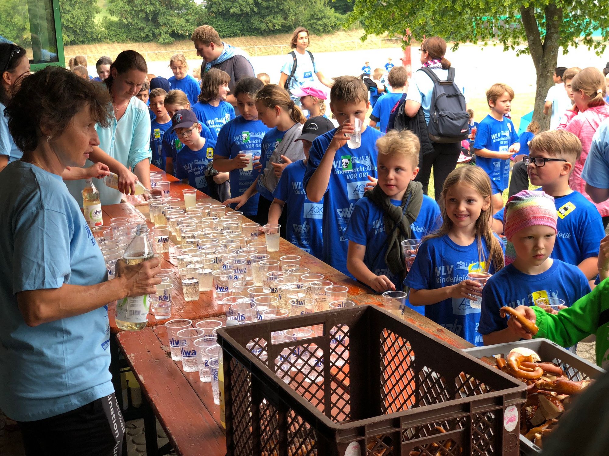 Damit alle bei Kräften blieben, gab es zwei große Pausen, in denen sich mit den vom WLV-Team mitgebrachten Getränke, von den Ansprechpartnern vor Ort besorgten Brezeln und Äpfeln und von den Eltern gebackenem Kuchen gestärkt werden konnte.