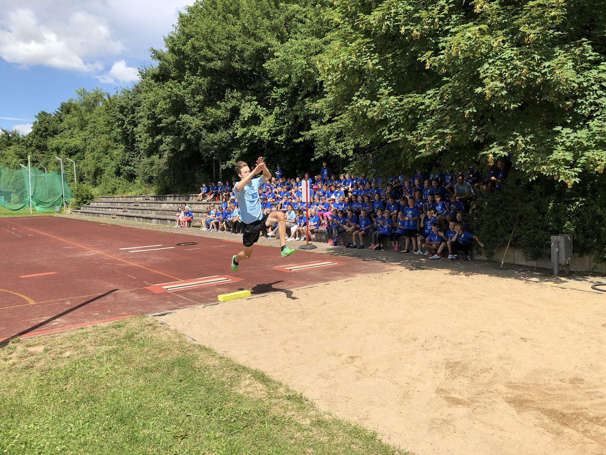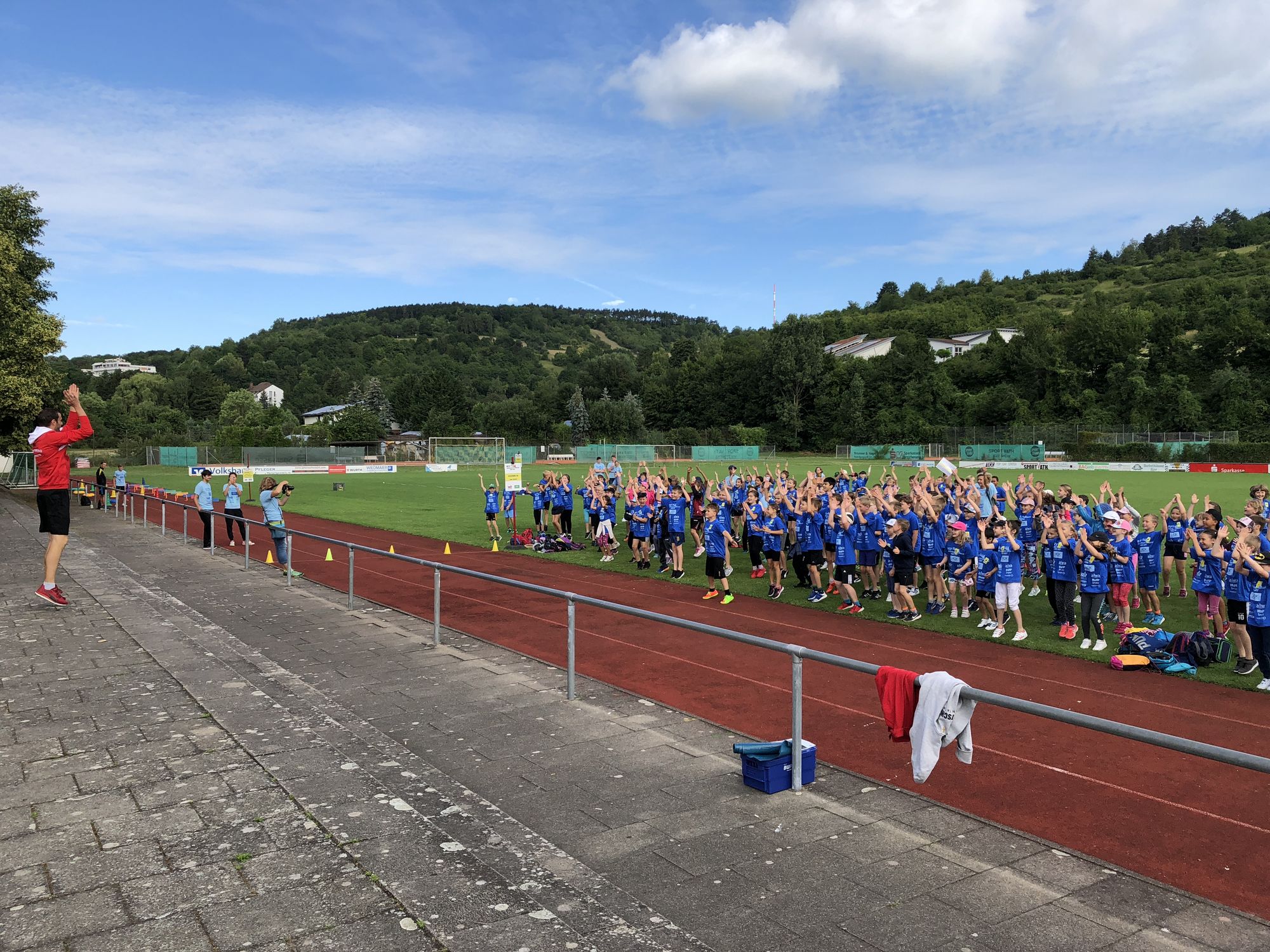 Die motivierten Helfer rund um Trainerin Christine Geldbach begrüßten bei strahlendem Sonnenschein das WLV-Team. Die 8 Stationen waren schnell aufgebaut, sodass alles bereitstand, als die Kinder eintrafen. Ausgestattet mit blauen T-Shirts gesponsert von der AOK und weiteren Projekt-Partnern konnte der spannende Sporttag beginnen. WLV-Praktikantin Maike Anstett bekam zum ersten Mal für die gesamte Veranstaltung das Mikrofon in die Hand und konnte damit innerhalb ihres Praktikums erste Moderations-Erfahrung sammeln.