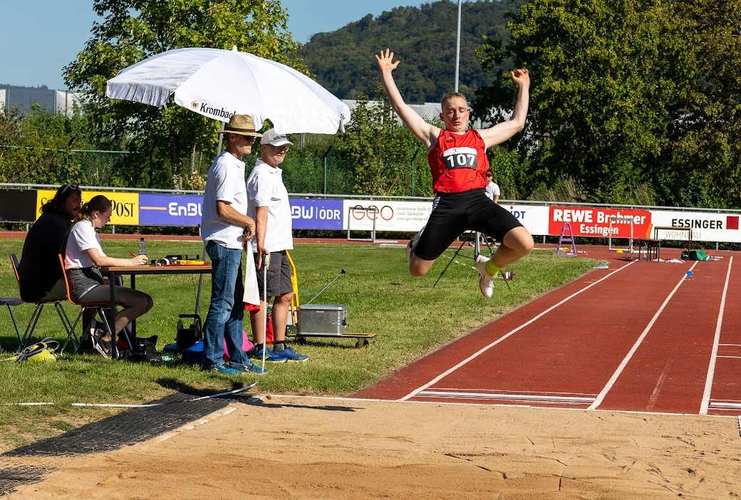 Und der wusste die Top-Bedingungen mit tollem Spätsommerwetter zu nutzen: Lokalmatador Justin Hopfensitz (TSV Oberkochen) steigerte sich bei seinem Dreisprungsieg um über einen Meter auf 13,34 Meter und rückte ebenso in die DLV-Top 3 auf wie Sina Stoll (TB Tailfingen), die den Hochsprung mit 1,70 Meter für sich entschied. Im Weitsprung verbesserte sich die ein Jahr jüngere Teresie Hess (SG Schorndorf 1846) auf 5,58 Meter und holte sich souverän den Sieg. Das gelang auch der deutschen Meisterin Mara Dümmler (VfL Sindelfingen), die nach übersprungenen 3,30 Meter gleich aufs Ganze ging und erst an der neuen deutschen Jahresbestleistung von 3,60 Meter scheiterte. Ebenfalls zwei Sprungsiege holten sich die Jungs: Hannes Klecker (SSV Ulm 1846) dominierte den Weitsprung mit 6,30 Meter, Henri Massing (MTV Stuttgart) lag im Hochsprung mit 1,82 Meter vorn. Während die Württemberger in den technischen Disziplinen überall vorn mitspielten, gelang das im Sprint und Lauf kaum. Lediglich mit Hürden gelangen zwei Erfolge: Luke Schmidt (SpVgg Holzgerlingen) holte sich in 11,30 Sekunden die Kurz-, Nina Sippel (LG Neckar-Enz) in 47,55 Sekunden die Langhürden. Sehr gut schlug sich die erstmals gelaufene 4x 800 Meter-Mixed-Staffel, die den stimmungsvollen Abschluss bildete: Nachdem Pitt Wanninger als Schlussläufer noch mal zu Bayern aufgeschlossen hatte, hatten die Weißblauen aber auch hier die Nase vorn.